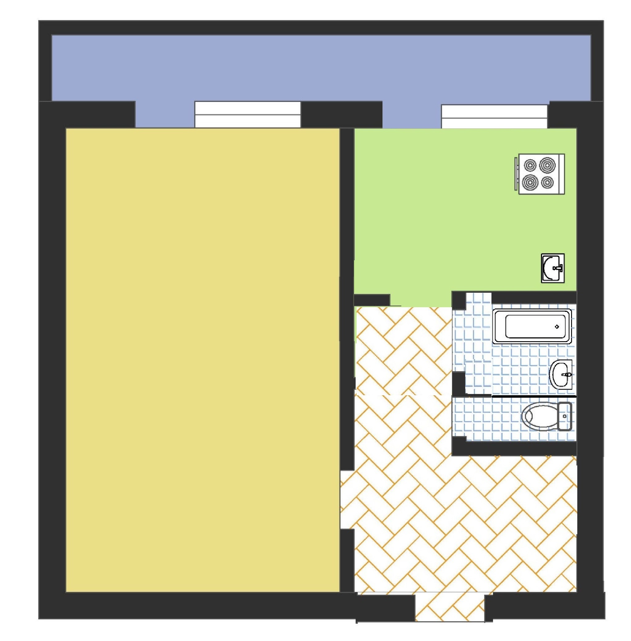 Общая площадь по кадастру 33.8 м2 + балкон.