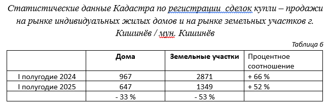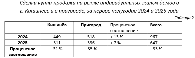 По данным Кадастра, за первое полугодие текущего 2025 года, было совершено 647 сделок купли – продажи индивидуальных жилых домов в г. Кишинёве и в пригороде, по сравнению с 2024 годом (967 сделок купли – продажи) меньше на 33 %. Одной из причин сокращения сделок – это снижение спроса на индивидуальные жилые дома по завышенным ценам и надежда покупателей на корректировку цен.