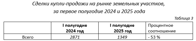 Из статистических данных Кадастра видно, что снижение сделок купли – продажи в 2025 году произошло, как на рынке индивидуальных жилых домов – 33 %, так и на рынке земельных участков – 53 %, по сравнению с этим же периодом 2024 года. Несмотря на существенное снижение сделок купли – продажи на рынке земельных участков, почти в два раза, рынок земельных участков остаётся в привилегированной позиции по сравнению с рынком индивидуальных жилых домов.
