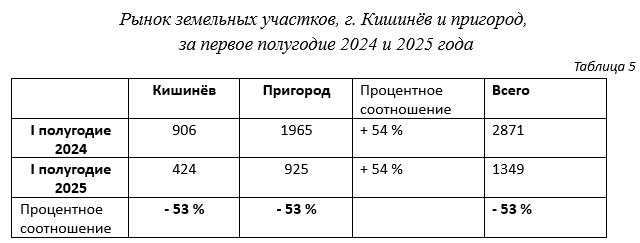 По данным Кадастра за первое полугодие 2024 года, на рынке земельных участков г. Кишинёве было зарегистрировано 906 сделок, в пригороде Кишинёва на 54 % больше и составило 1965 сделок.  В 2025 году в Кишинёве зарегистрировано 424 сделок купли – продажи, а в пригороде 925 сделок. Количество сделок купли – продажи на рынке индивидуальных жилых домов в пригороде на 54 % больше чем в Кишинёве. На пригороды приходится большая часть дачных участков, соответственно, количество сделок больше, чем в городе. В статистику рынка земельных участков попадают также продажи дачных домов, которые официально не сданы в эксплуатацию. А в городе в эту категорию включаются и объекты с неликвидными и ветхими строениями.
