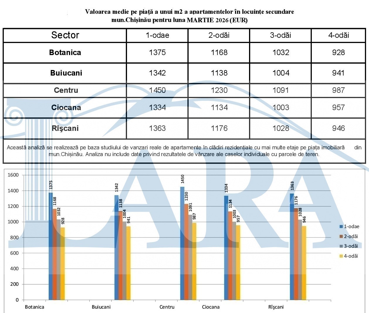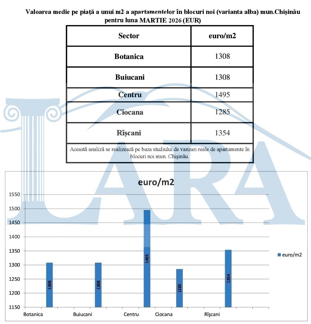Valoarea medie pe piaţă a unui m2 a apartamentelor în mun.Chişinău pentru luna MARTIE 2026 (EUR)