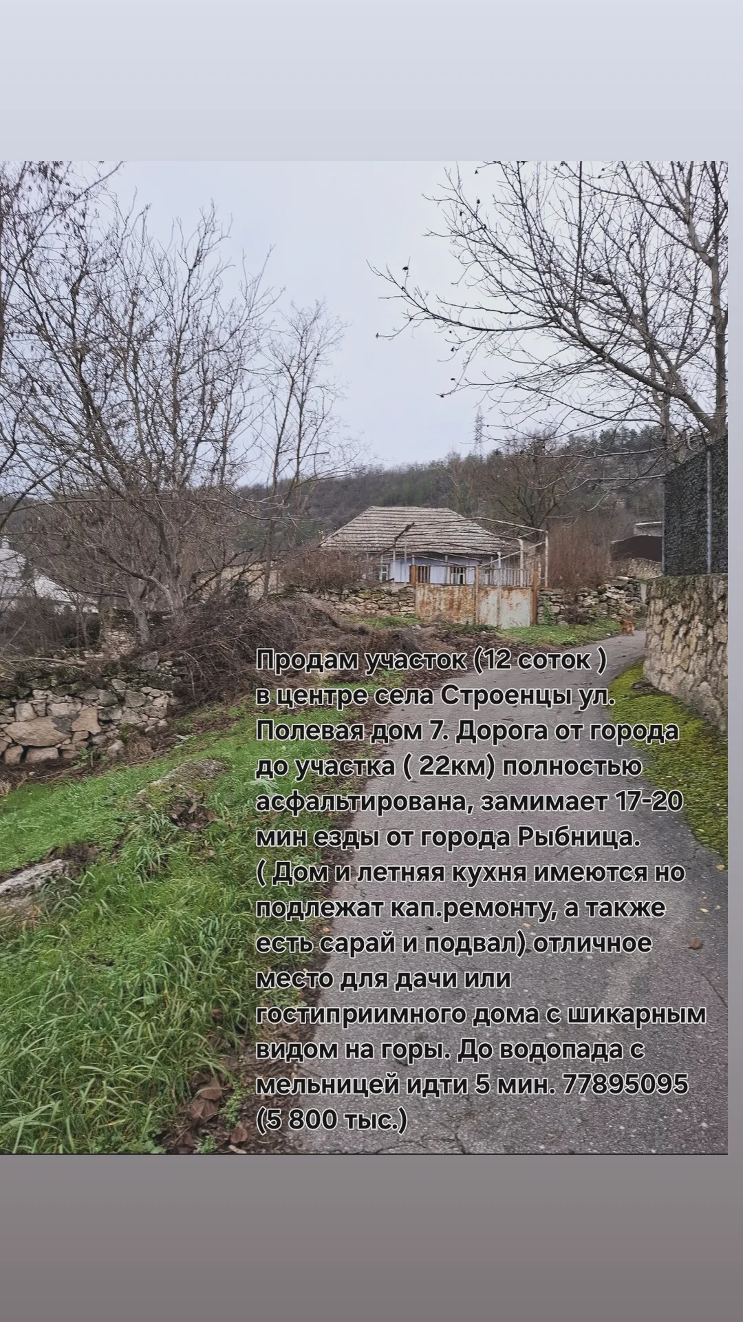 в центре села Строенцы ул. Полевая дом 7. Дорога от города до участка ( 22км) полностью асфальтирована, замимает 17-20 мин езды от города Рыбница. ( Дом и летняя кухня имеются но подлежат кап.ремонту, а также есть сарай и подвал) отличное место для дачи или гостиприимного дома с шикарным видом на горы. До водопада с мельницей идти 5 мин.